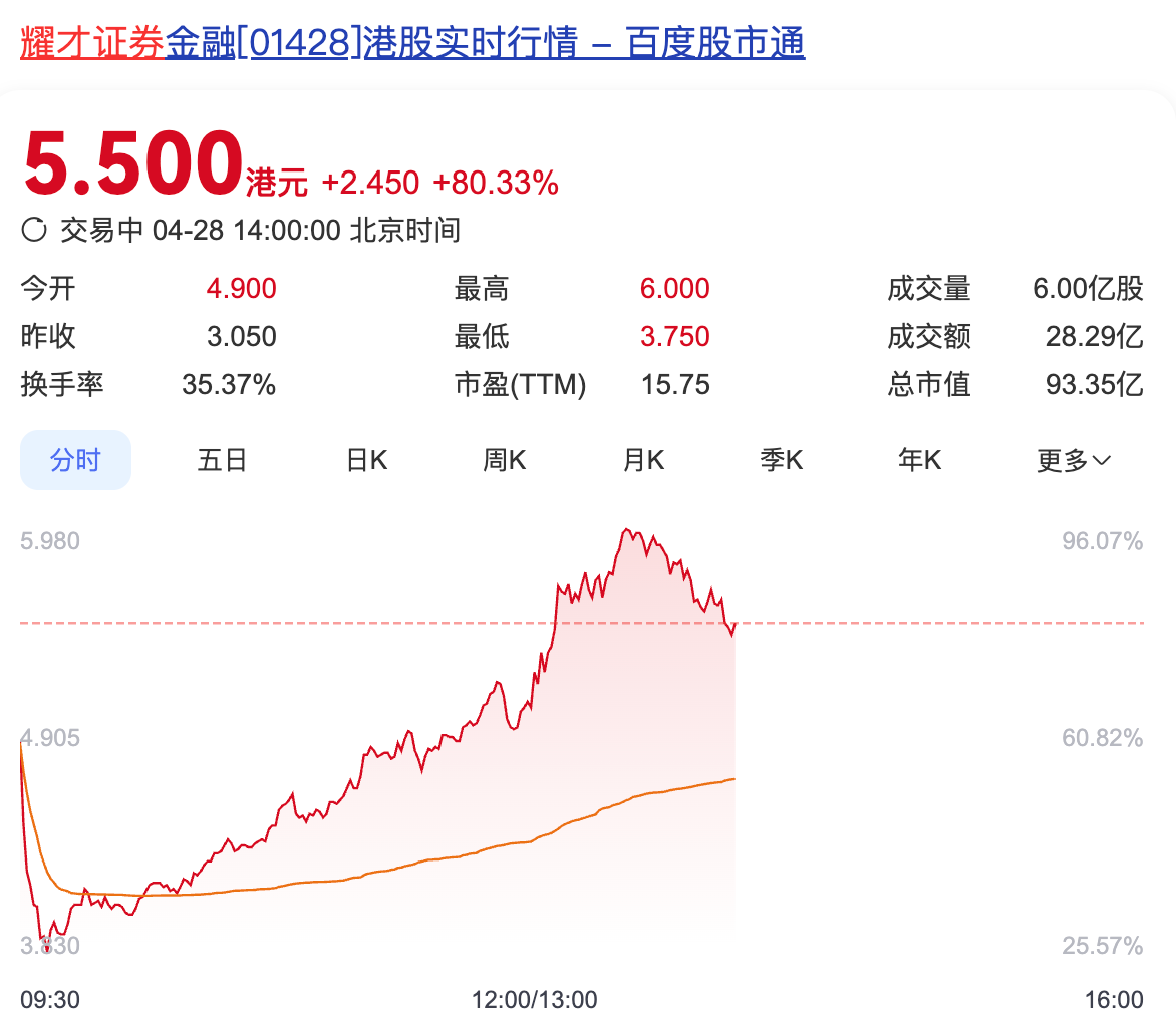 【环球网金融综合报道】4月28日,港股上市公司耀才证券股价大涨,盘中最高涨至6港元/股,涨幅超95%。截至下午两点,股价为5.5港元/股,涨幅为80%。